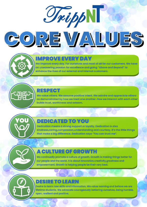 TrippNT has five core values. These values were identified and refined by the employees in 2020. We have written a definition of each value. Additionally, we have defined a set of behaviors that demonstrate an employee is living this value. |
