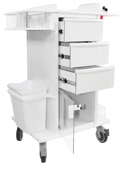 The Phlebotomy Pro Cart is designed for long days of sample collection in healthcare settings. Developed by hospital phlebotomists, this cart is equipped to hold supplies for collecting samples from 60–80 patients per shift—completely self-contained.