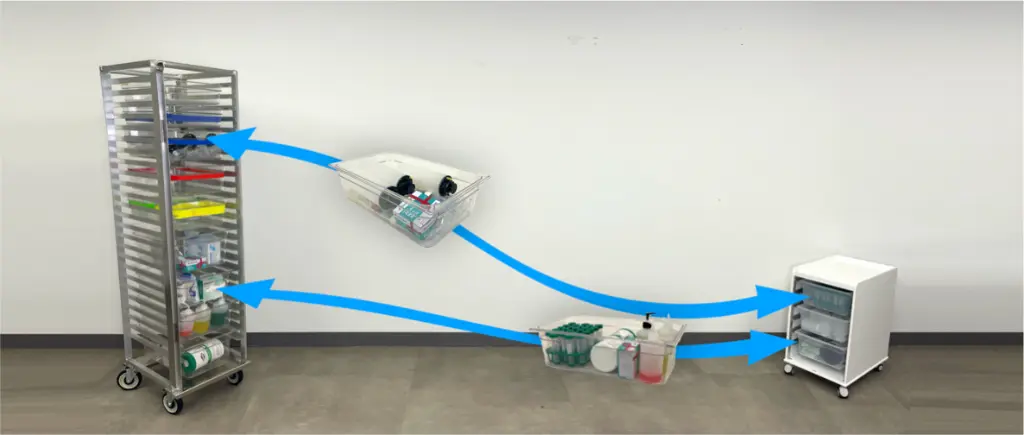 The problem is that most storage solutions waste valuable space and don't connect the way work actually flows between storage areas and the hood or bench. We understand how frustrating it is to waste time hunting for supplies or rearranging materials just to get work done. That's why we created the LabFlow system - storage racks and hood carts designed to work together with one standardized tray, so you can move supplies seamlessly between storage and point of use without wasted space or wasted motion.
