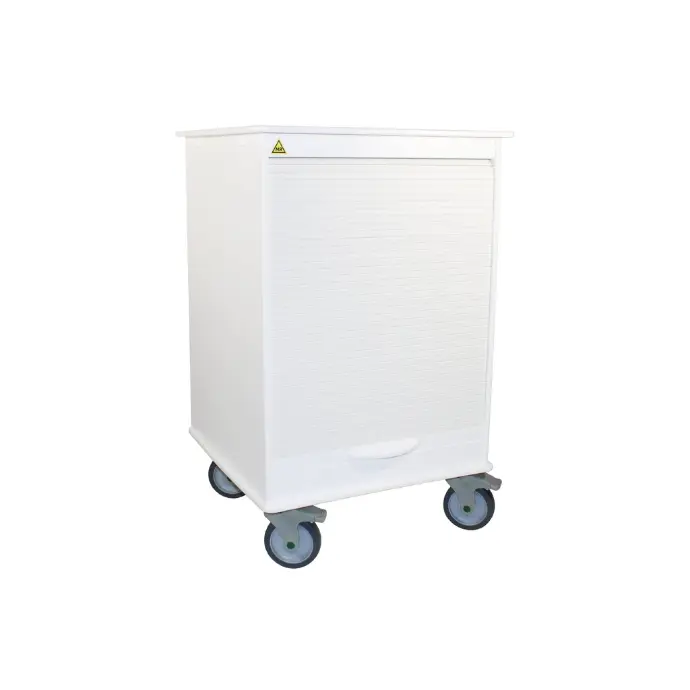 Tall, space-efficient cart with a secure roll-top door and customizable trays for organized storage in tight MRI corridors.