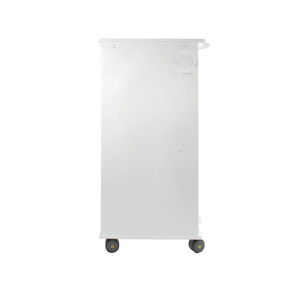- 2 Locking Casters, 2 Swivel Casters, 6 Removable Pocket Trays, White Locking Roll Top Door